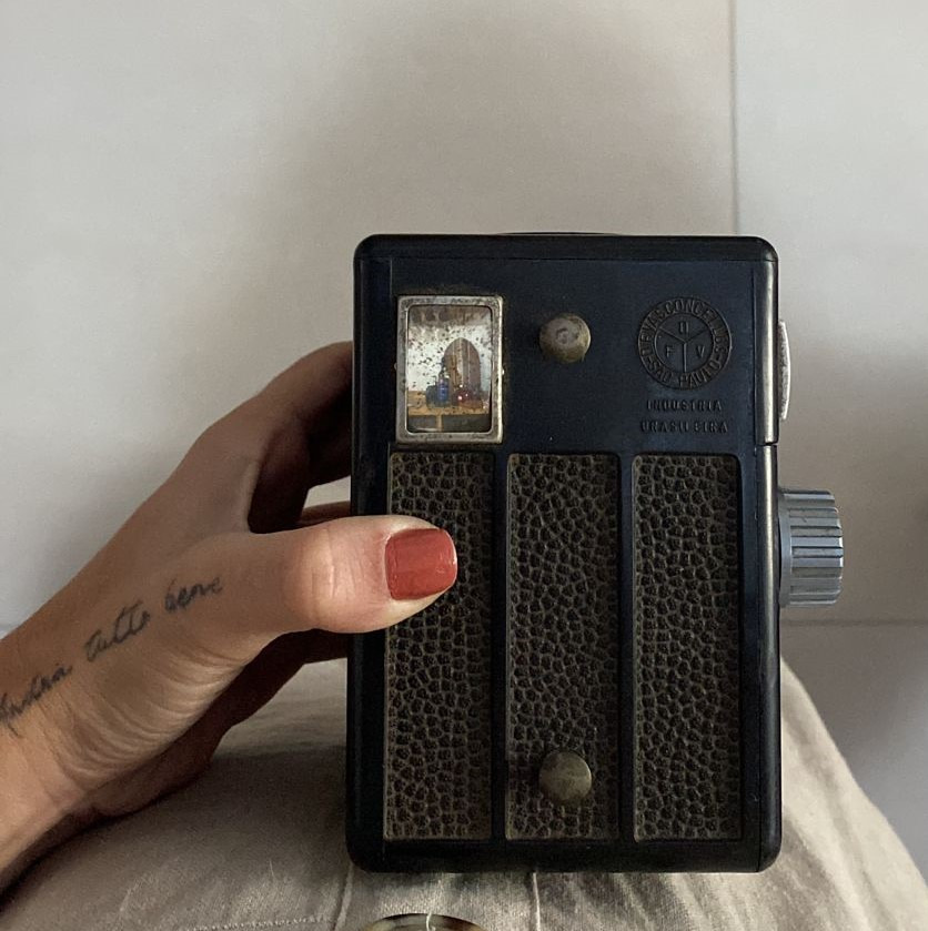 Para usar deve-se segura-la na altura da barriga para conseguir ver a imagem pelo "viewfinder" que vai refletir a imagem da lente.